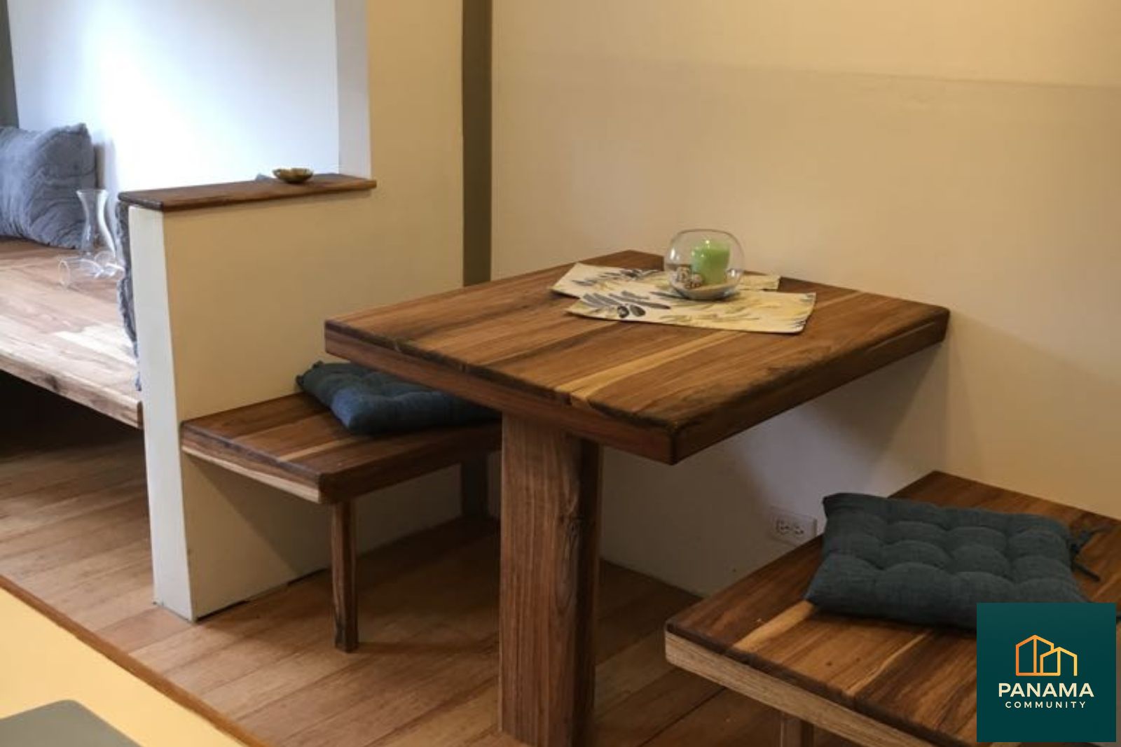 Essbereich im Containerhaus in Panama mit Massivholz Tisch, Holzbank und Bambusboden
